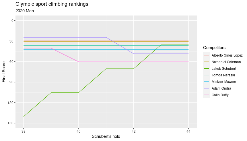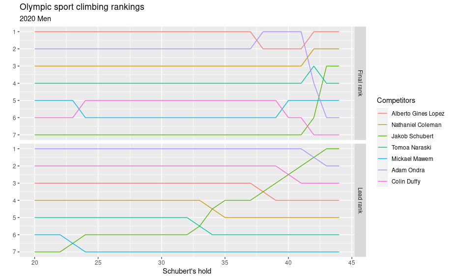 Lead climbing is the final discipline and Schubert was the last climber. This meant that ranks for speed climbing and bouldering were already decided. However, the final rankings of the climbers fluctuated hugely as Schubert scaled the 15 metre lead wall. This was because if a climber had done really well in the boulder and speed rounds, being overtaken by Schubert didn’t increase their final score by that much. However, if a climber did poorly in the previous rounds, then being overtaken by Schubert meant their score increased by a lot and they plummeted down the rankings. This can be visualised in the following plot: