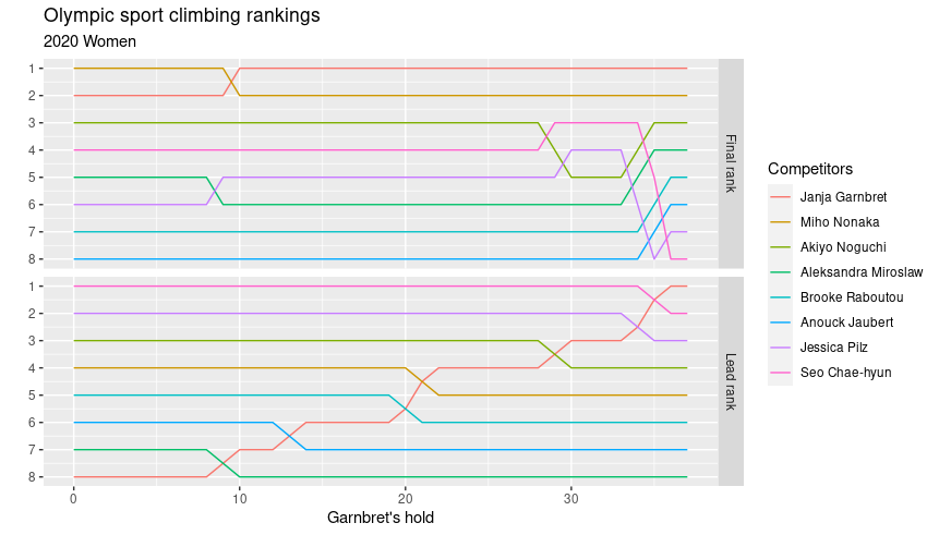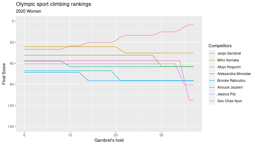 Similar things happened in the women’s finals. Janja Garnbret was the last lead climber in the women’s final. Here is the same plot which shows the climbers’ final rankings and lead ranking.
