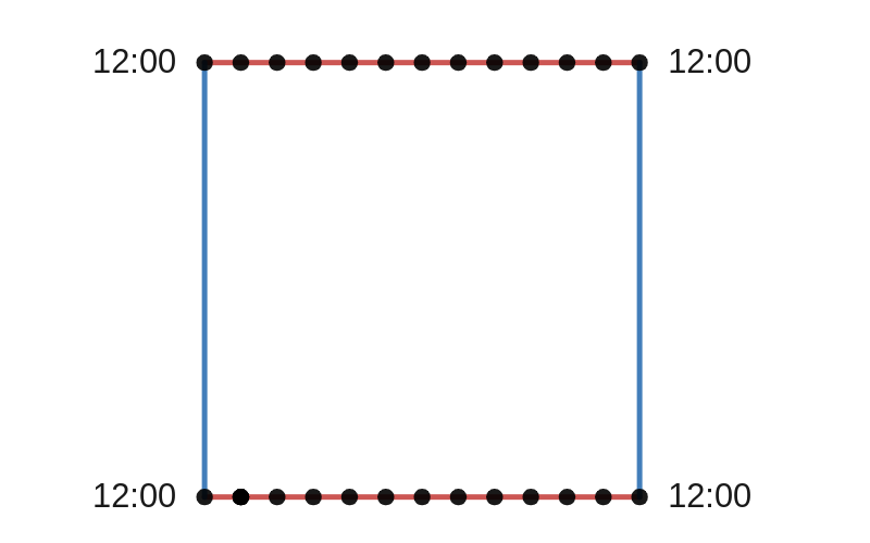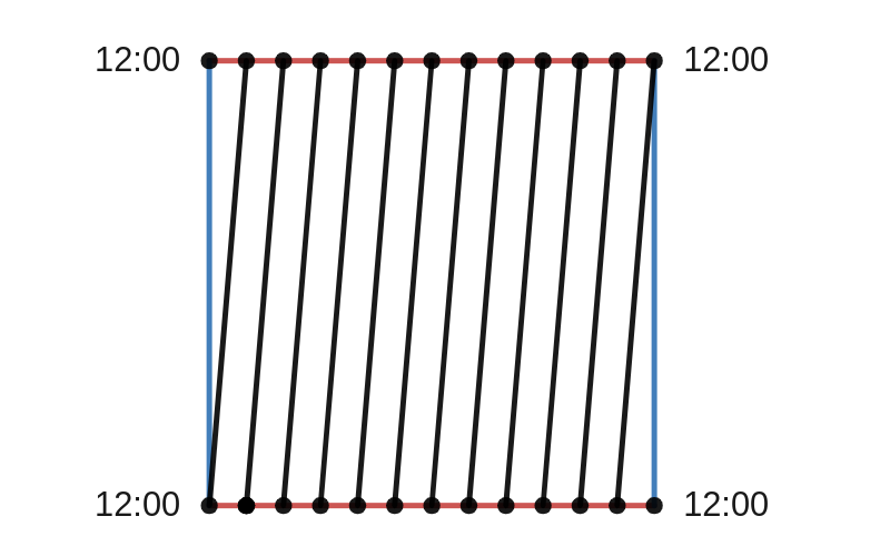 Points on the black line correspond to actual times on the clock. Although it looks like there are 12 different lines, there is actually only one line once we glue the opposite sides together.