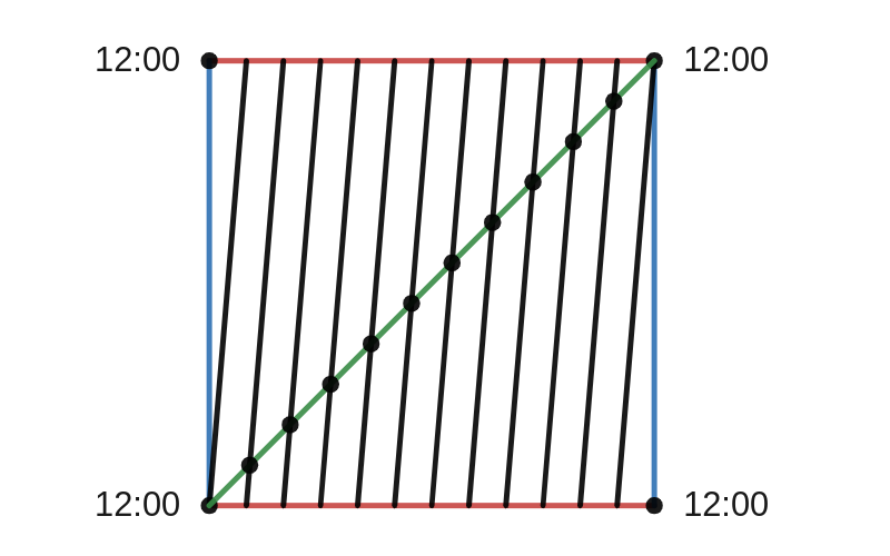 One nice thing about this picture is that it can help us answer a classic riddle. In a 12-hour cycle, how many times are the minute and hour hands on top of each other? We can answer this riddle by adding a second line to the above square. The bottom-left to top-right diagonal is the collection of all hand positions where the two hands are on top of each other. Let’s add that line in green and add the points where this new line intersects the black line.