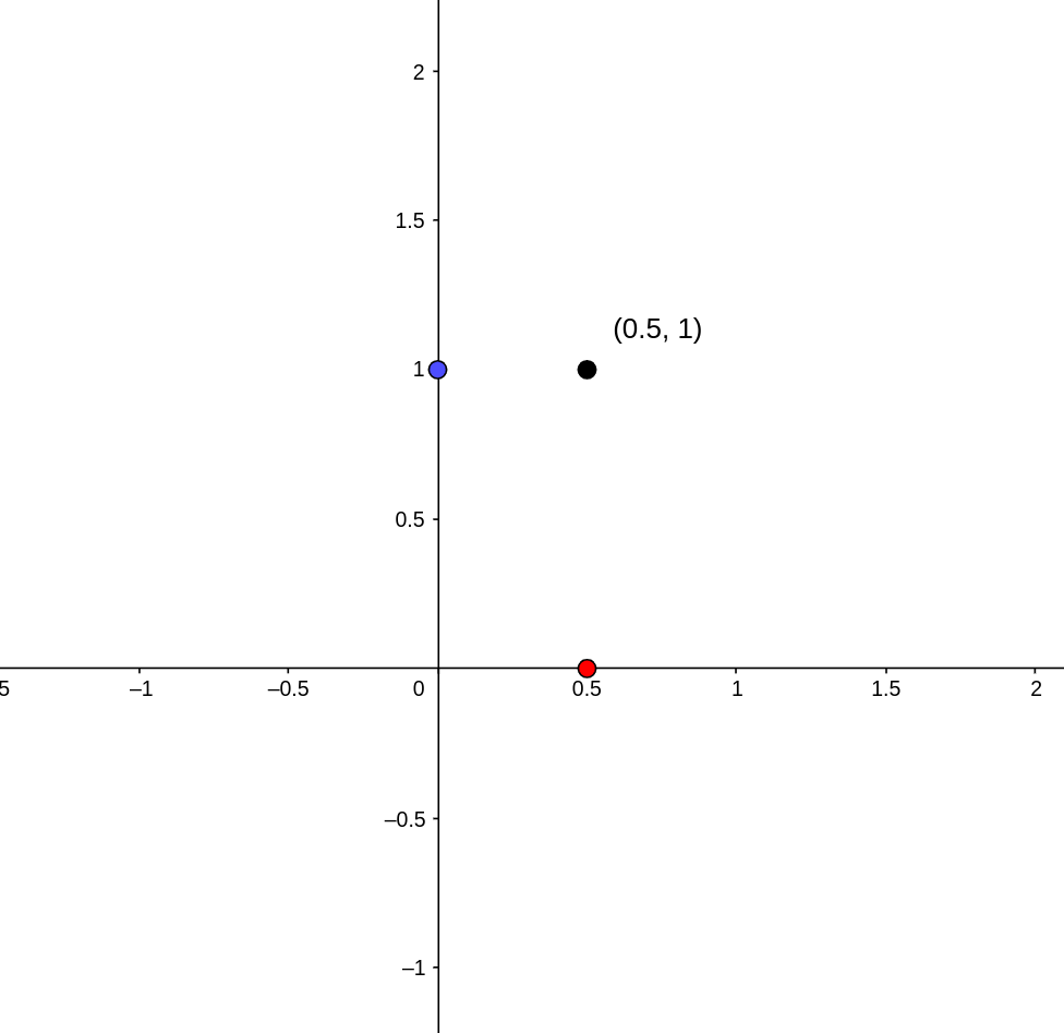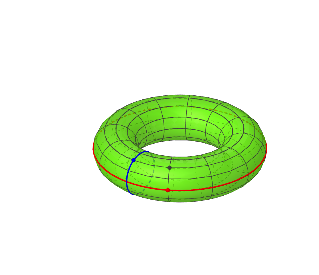 To understand the torus, it’s helpful to consider a more familiar example, the 2-dimensional plane. If we have points \(x\) and \(y\) on two different lines, then we can produce the point \((x,y)\) in the two dimensional plane. Likewise, if we have a point \(p\) and a point \(q\) on two different circles, then we can produce a point \((p,q)\) on the torus. Both of these concepts are illustrated below. I have added two circles to the torus which are analogous to the x and y axes of the plane. The blue and red points on the blue and red circle produce the black point on the torus.