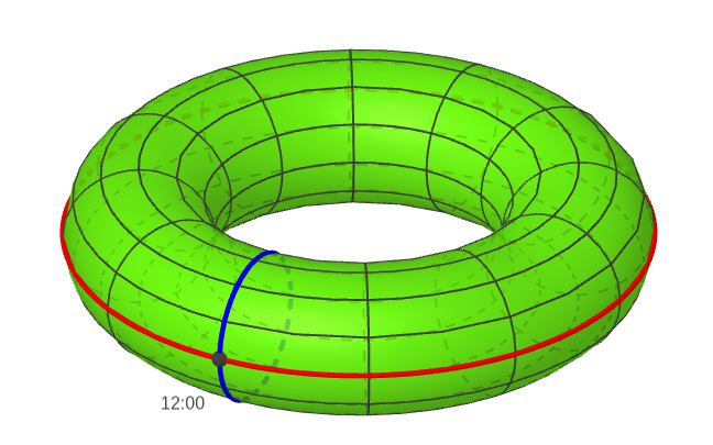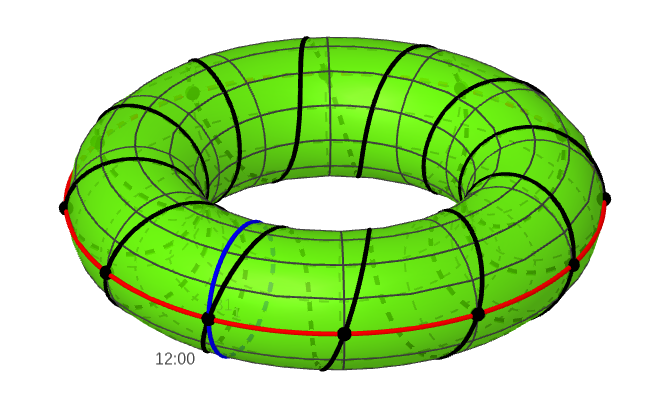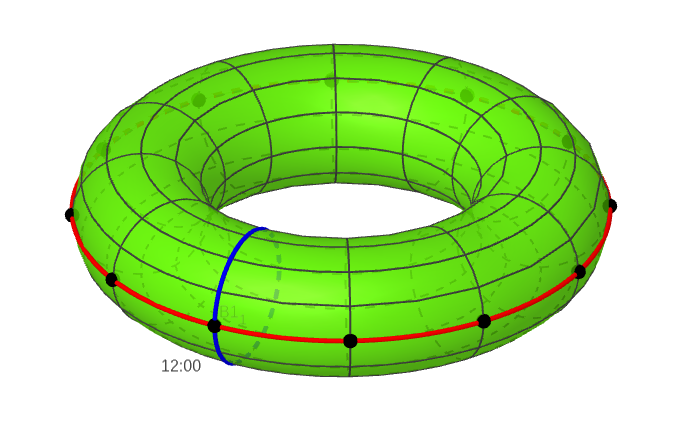 There are eleven other points on the red line that correspond to the other times when the minute hand is at 12. That is, there’s a point for 1 o’clock, 2 o’clock, 3 o’clock and so on. Once we add in those points, our torus looks like this: