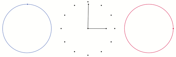 Keeping with our previous convention, let’s use the blue circle to represent the position of the minute hand and the red circle to represent the position of the hour hand. This means that the point where the two circles meet corresponds to 12 o’clock.