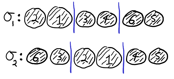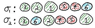 Note that a permutation \(\sigma \in S_n\) is in \(S_b\) if and only if we draw the balls by colour groups, i.e. we first draw all the balls with colour \(c_1\), then we draw all the balls with colour \(c_2\) and so on. Thus, continuing with the previous example, the permutation \(\sigma_1\) below is in \(S_b\) but \(\sigma_2\) is not in \(S_b\).
