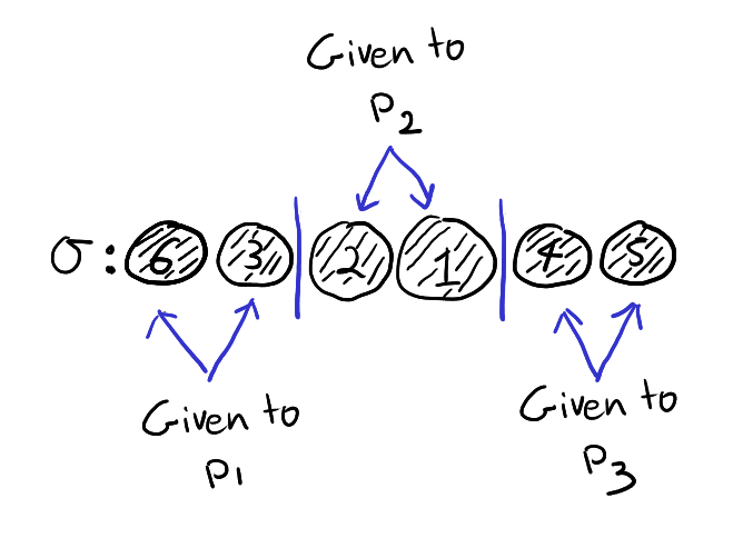 Fix a partition \(a = (a_1,a_2,\ldots,a_I)\) and now, instead of considering \(I\) colours, think of \(I\) different people \(p_1,p_2,\ldots,p_I\). As before, a permutation \(\sigma \in S_n\) can be thought of drawing \(n\) balls labelled \(1,\ldots,n\) without replacement. We can imagine giving the first \(a_1\) balls drawn to person \(p_1\), then giving the next \(a_2\) balls to the person \(p_2\) and so on until we give the last \(a_I\) balls to person \(p_I\). An example with \(n = 6\) and \(a = (2,2,2)\) is drawn below.