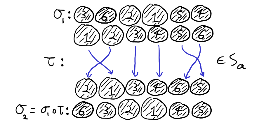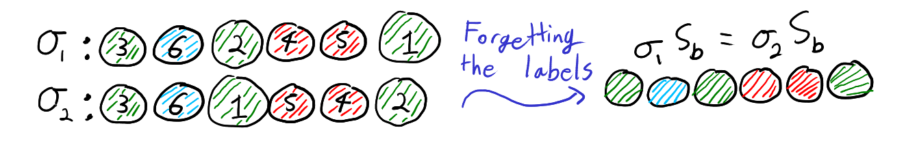 To see why this is true, note that \(\sigma_1 S_b = \sigma_2 S_b\) if and only if \(\sigma_2 = \sigma_1 \circ \tau\) for some \(\tau \in S_b\). Furthermore, \(\tau \in S_b\) if and only if \(\tau\) maps each colour group to itself. Recall that function composition is read right to left. Thus, the equation \(\sigma_2 = \sigma_1 \circ \tau\) means that if we first relabel the balls according to \(\tau\) and then draw the balls according to \(\sigma_1\), then we get the result as just drawing by \(\sigma_2\). That is, \(\sigma_2 = \sigma_1 \circ \tau\) for some \(\tau \in S_b\) if and only if drawing by \(\sigma_2\) is the same as first relabelling the balls within each colour group and then drawing the balls according to \(\sigma_1\). Thus, \(\sigma_1 S_b = \sigma_2 S_b\), if and only if when we forget the labels of the balls and only look at the colours, \(\sigma_1\) and \(\sigma_2\) give the same list of colours. This is illustrated with our running example below.
