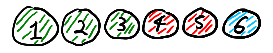 We can think of the permutations in \(S_n\) as all the ways of drawing without replacement \(n\) balls labelled \(1,2,\ldots, n\). We can think of the partition \(b = (b_1,b_2,\ldots,b_J)\) as a colouring of the \(n\) balls by \(J\) colours. We colour balls \(1,2,\ldots, b_1\) by the first colour \(c_1\), then we colour \(b_1+1,b_1+2,\ldots, b_1+b_2\) the second colour \(c_2\) and so on until we colour \(n-b_J+1, n-b_J+2,\ldots, n\) the final colour \(c_J\). Below is an example when \(n\) is equal to 6 and \(b = (3,2,1)\).