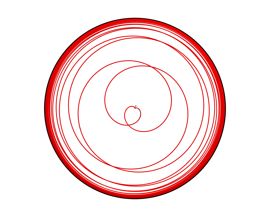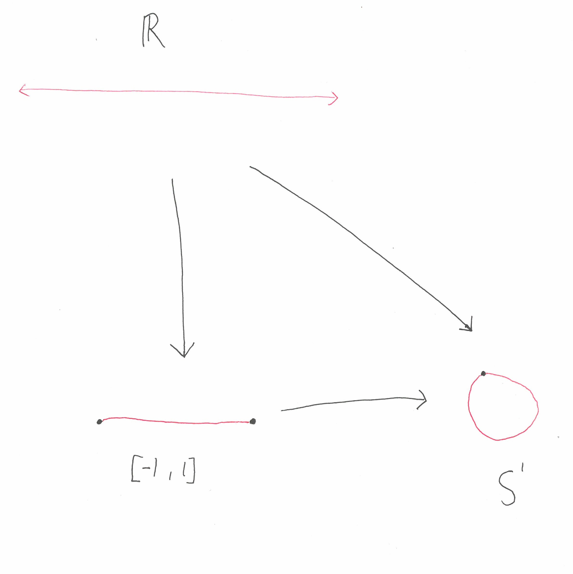 Here we have the black circle sitting in the x,y plane of \(\mathbb{R}^3\). The red line is a copy of \(\mathbb{R}\) that spirals towards the circle. Negative numbers sit below the circle and positive numbers sit above. On left is a sideways view of this space and on the right is the view from above. I made these images in geogebra. If you follow this link, you can see the equations that define the above space and move the space around.