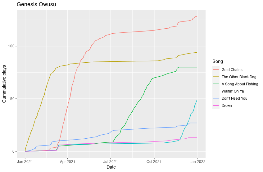 This code takes a little while to run so I have saved the output as a .csv file. There are lots of things I hope to do with this data such as looking at the popularity of different songs over time. For example, here’s a plot showing the cumulative plays of Genesis Owusu’s top six songs.
